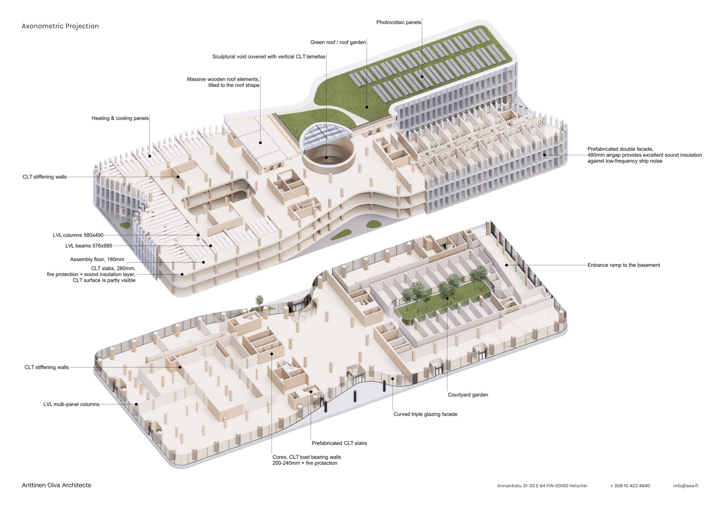 Katajanokan Laituri is a solid wood office and hotel building that sets an example in the possibilities of wood construction in a sensitive urban environment. As the first new building on the formerly industrial Katajanokka waterfront that directly connects to Helsinki’s iconic maritime cityscape, Katajanokan Laituri spearheads the transition of this embankment into an open urban space accessible to all. It continues the uniform, neo-classical silhouette of Helsinki along its southern waterfront, while the meandering shapes of its façade break its scale, connecting it to the diverse and layered building stock of the Katajanokka peninsula. A double-structure on the façade, with an outer layer of glass, aluminum, and granite that protects the exposed wood structures from the maritime weather, connects the building to the wider cityscape and...… see more here
